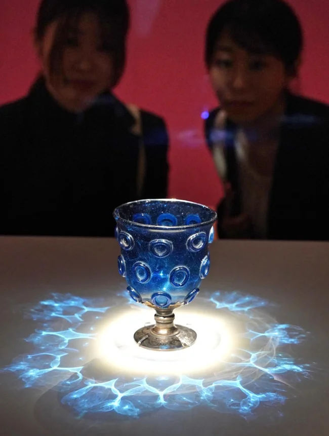 8. Сасанідський синій скляний кубок на срібній основі, подарований імператриці Кеме (701-760 рр. н.е.). В даний час зберігається в Репозиторії Сесоїн в Нарі, Японія