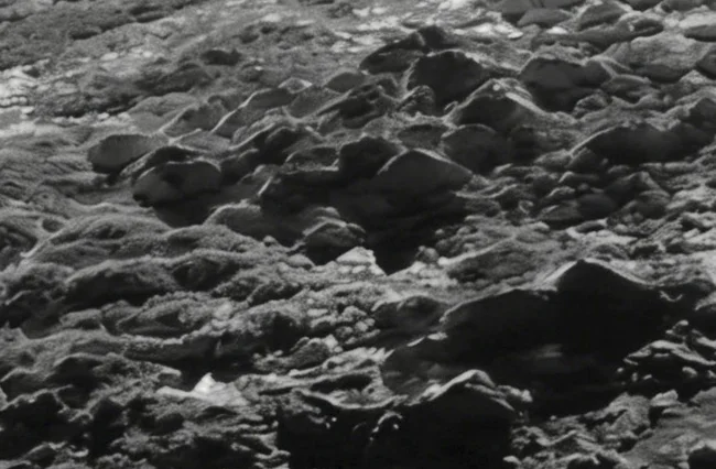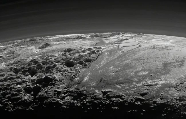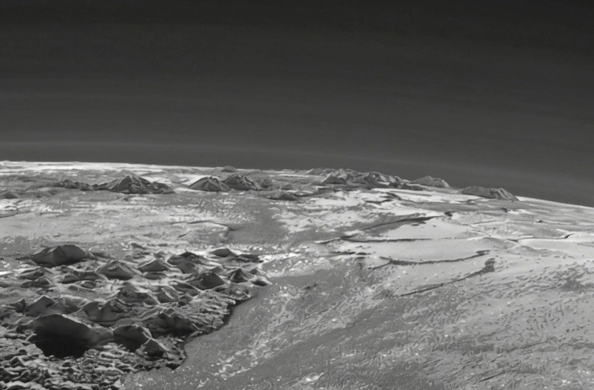 Погляд зонда "Нові горизонти" на Плутон за 15 хвилин після максимального зближення з карликовою планетою. На момент зйомки апарат знаходився на відстані близько 18 000 кілометрів. Зображення було покращено за допомогою ІІ
