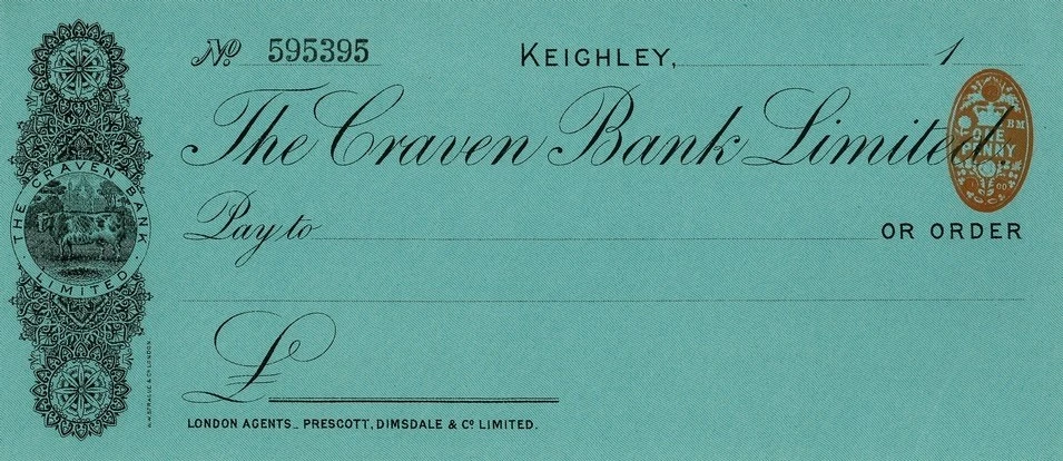Чек початку XX століття, виданий відділенням у Кейлі, з емблемою Craven Heifer