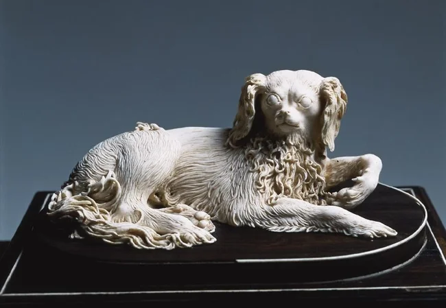 11. Скульптура собаки зі слонової кістки на скриньці з чорного дерева, XVII століття н.е., знаходиться в Музеї срібла Палаццо Пітті у Флоренції, Італія