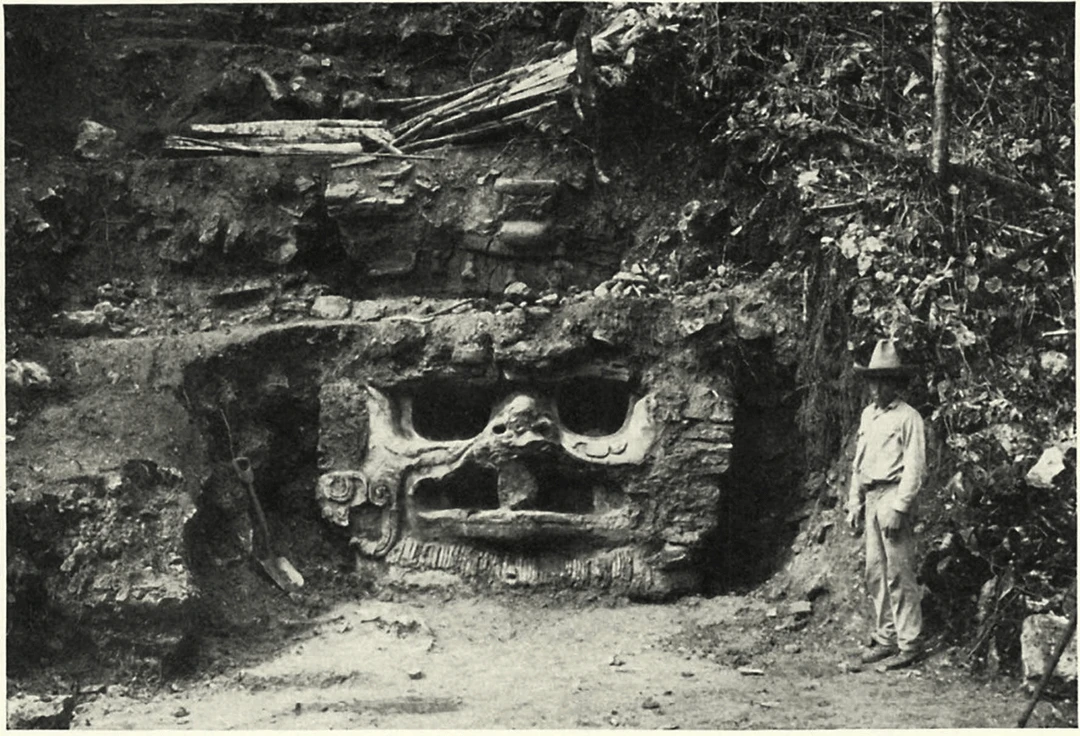1. Фотографія 1935 року, на якій зображено велику маску на пірамідальній споруді в стародавньому місті майя П'єдрас-Неграс у Гватемалі