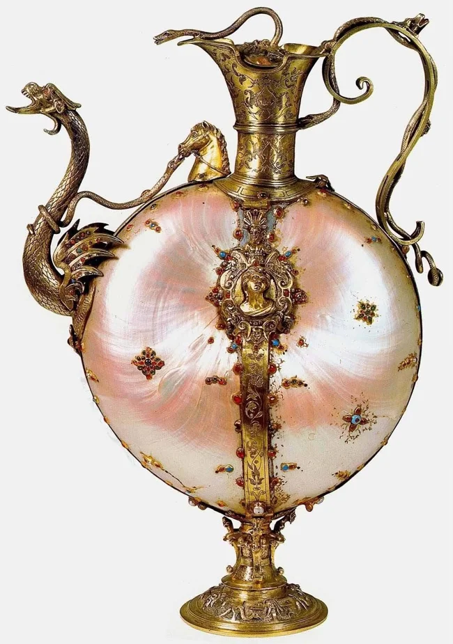 7. Глечик, оправлений у срібло з позолотою і прикрашений перламутром, рубінами та бірюзою. Близько 1590 н.е.
